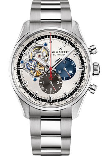 42 mm stainless steel case, silver-toned sunray-patterned dial with two different-coloured counters, El Primero 4061 automatic movement with chronograph, approximately 50 hours of power reserve, stainless steel bracelet. Water resistant to 10 ATM.